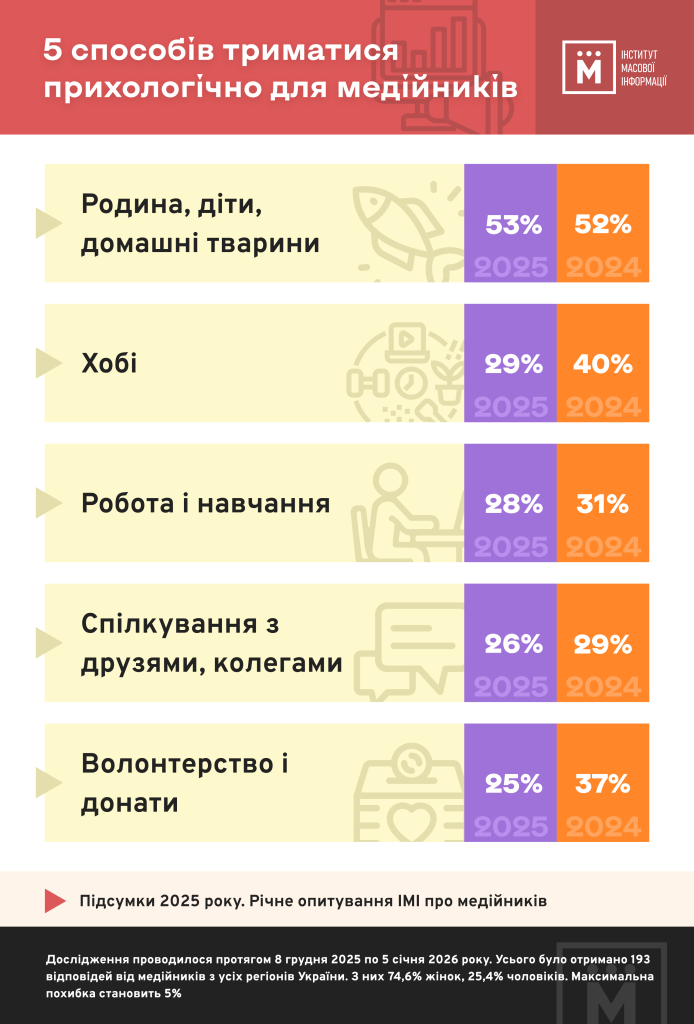 Водночас частка тих, хто використовує хобі як спосіб психологічної підтримки, скоротилася до 29% у 2025 році порівняно з 40% у 2024-му. Частка журналістів, які намагаються втриматися за рахунок інтенсивнішої роботи або навчання, становить 28% і знизилася порівняно з 2023 роком (34,2%).